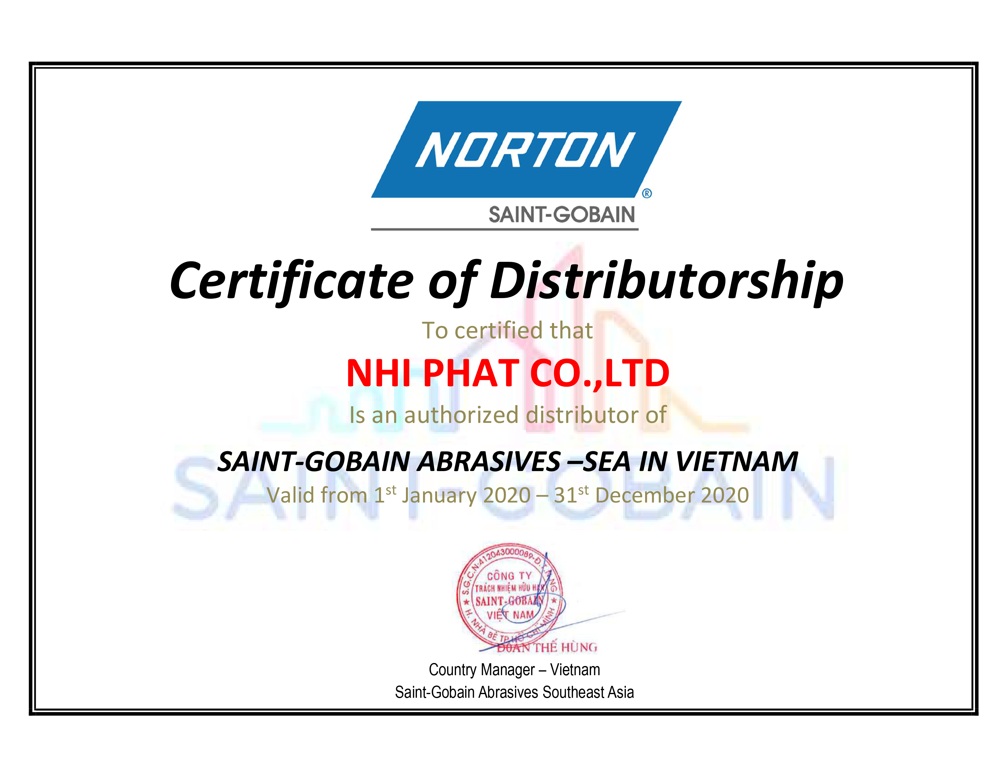 Từ năm 2012 đến nay, Công ty chúng tôi đã được Tập đoàn Saint- Gobain (Pháp) chứng nhận là nhà phân phối chính cho các sản phẩm đá cắt, đá mài, nhám các loại, lưỡi cắt gạch nhãn hiệu Norton Expert nổi tiếng nhiều năm trên thị trường, tập đoàn Saint-Gobain là ” Nhà sản xuất vật liệu mài mòn hàng đầu thế giới”.